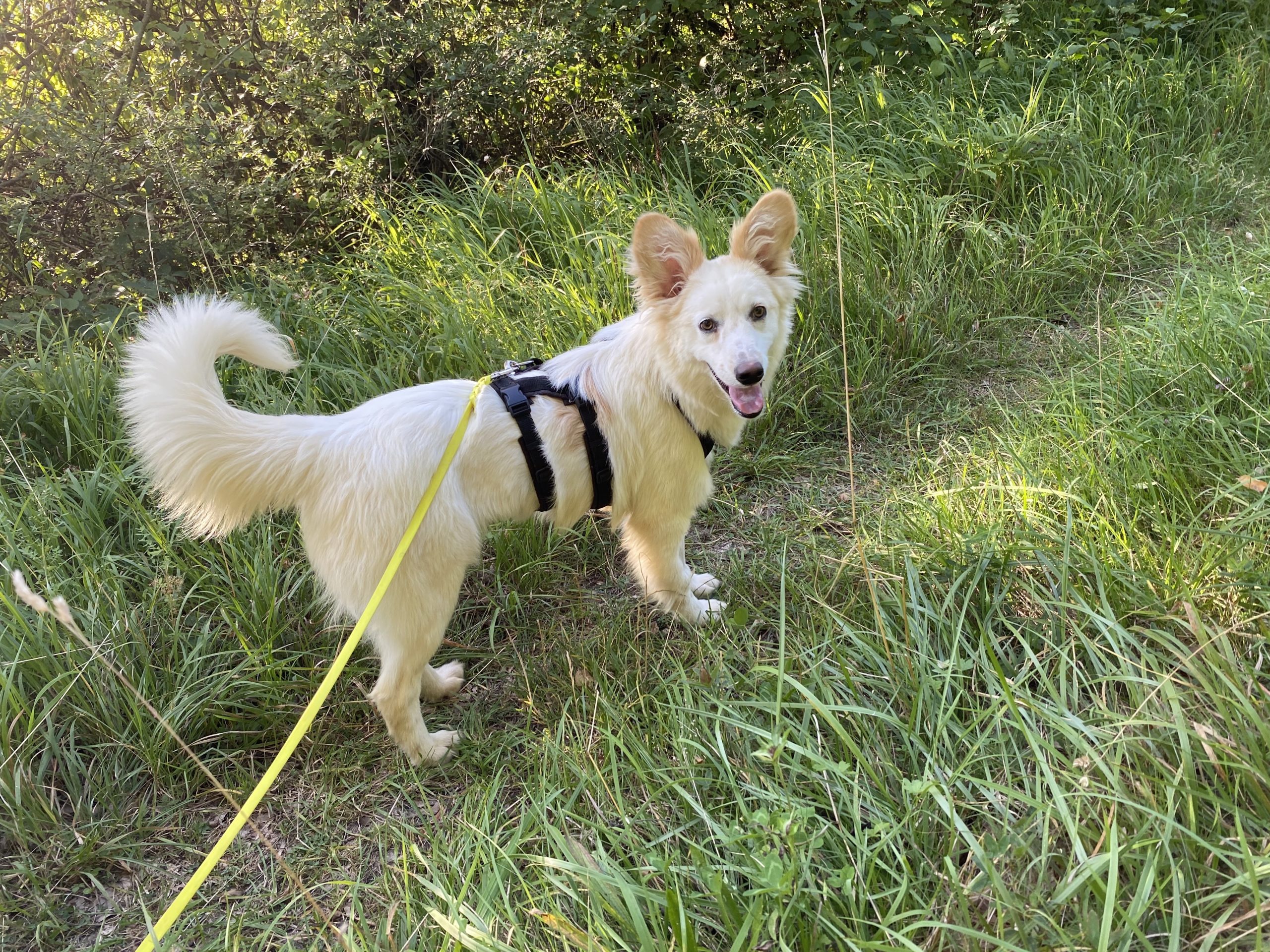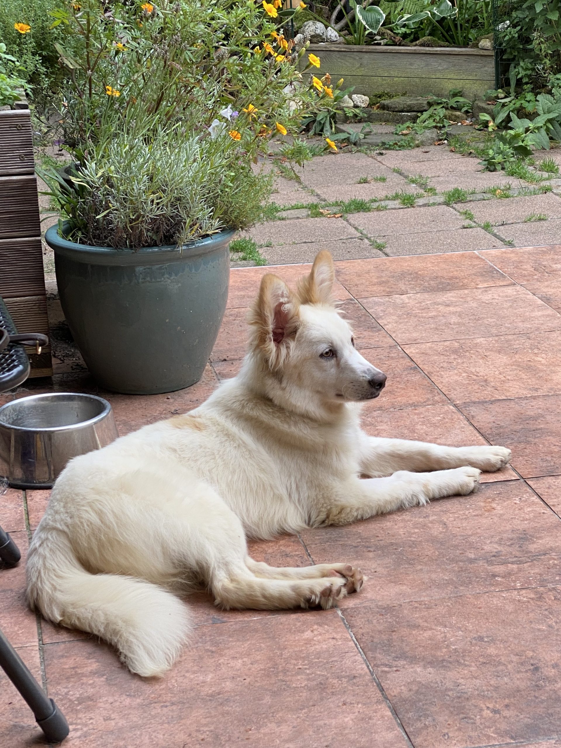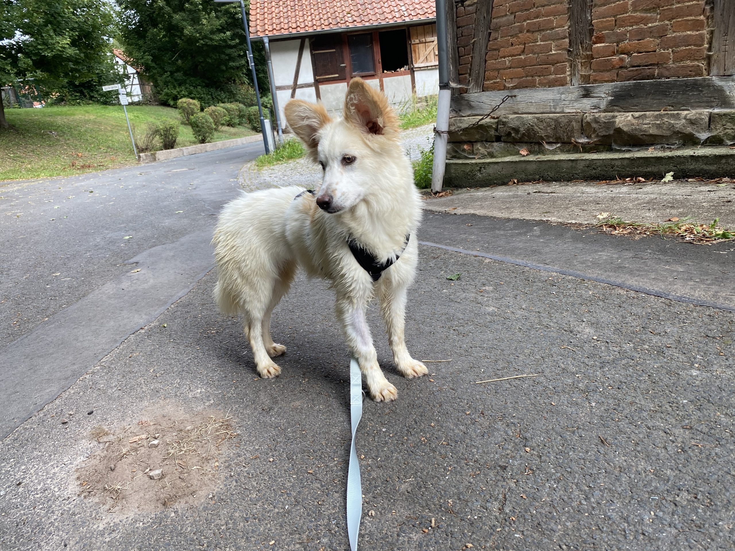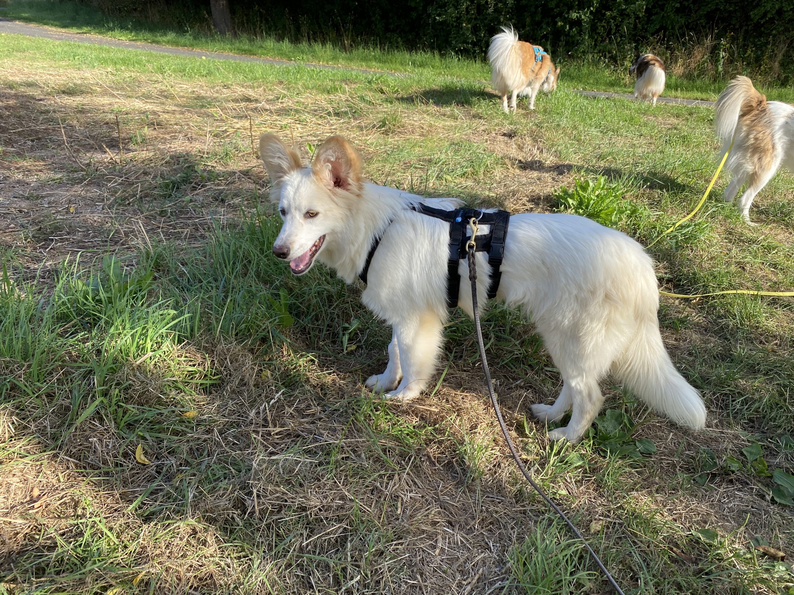 Die kleine Hündin hat eigentlich immer gute Laune, lässt sich von den anderen Hunden sehr gut anleiten und ist ständig auf Entdeckungstour in Haus und Garten, alles ist neu, spannend und ungemein lustig für sie.