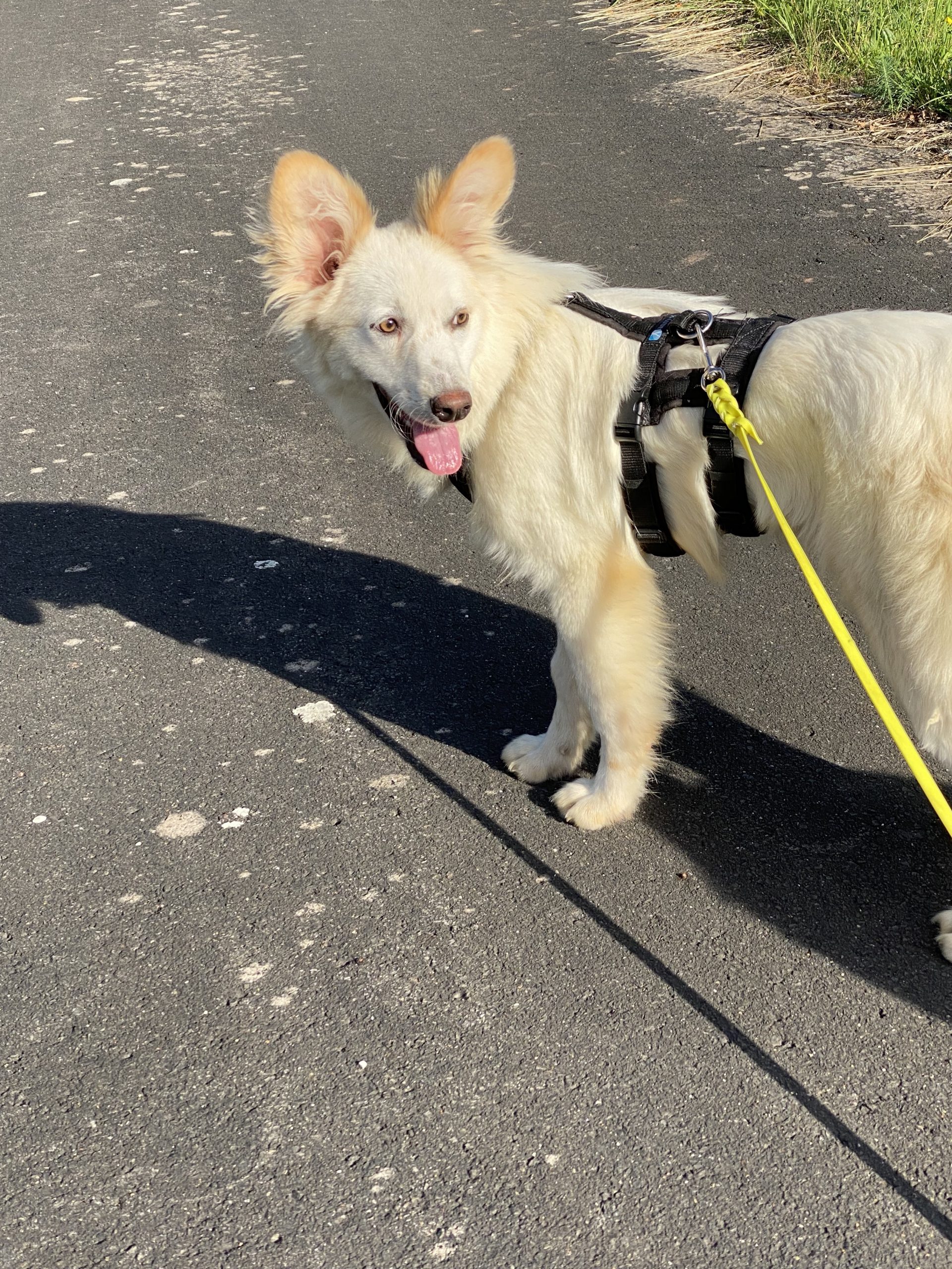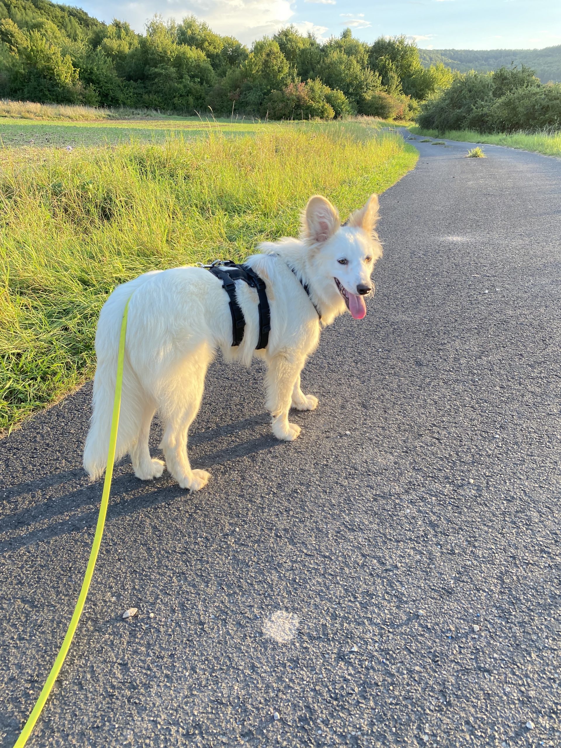Uns Menschen findet sie manchmal recht seltsam, was ich auch gut verstehen kann. Sie ist neugierig, vergewissert sich aber immer wieder, was Jaila oder Sholeen dazu zu sagen haben. Insbesondere Sholeen ist so eine Art Ziehmama für sie. Beim Spazieren gehen läuft sie brav an der Leine, aber vor lauter Ungeduld und Neugier zieht sie noch ein bisschen an der Leine, aber sie ist lernfähig.