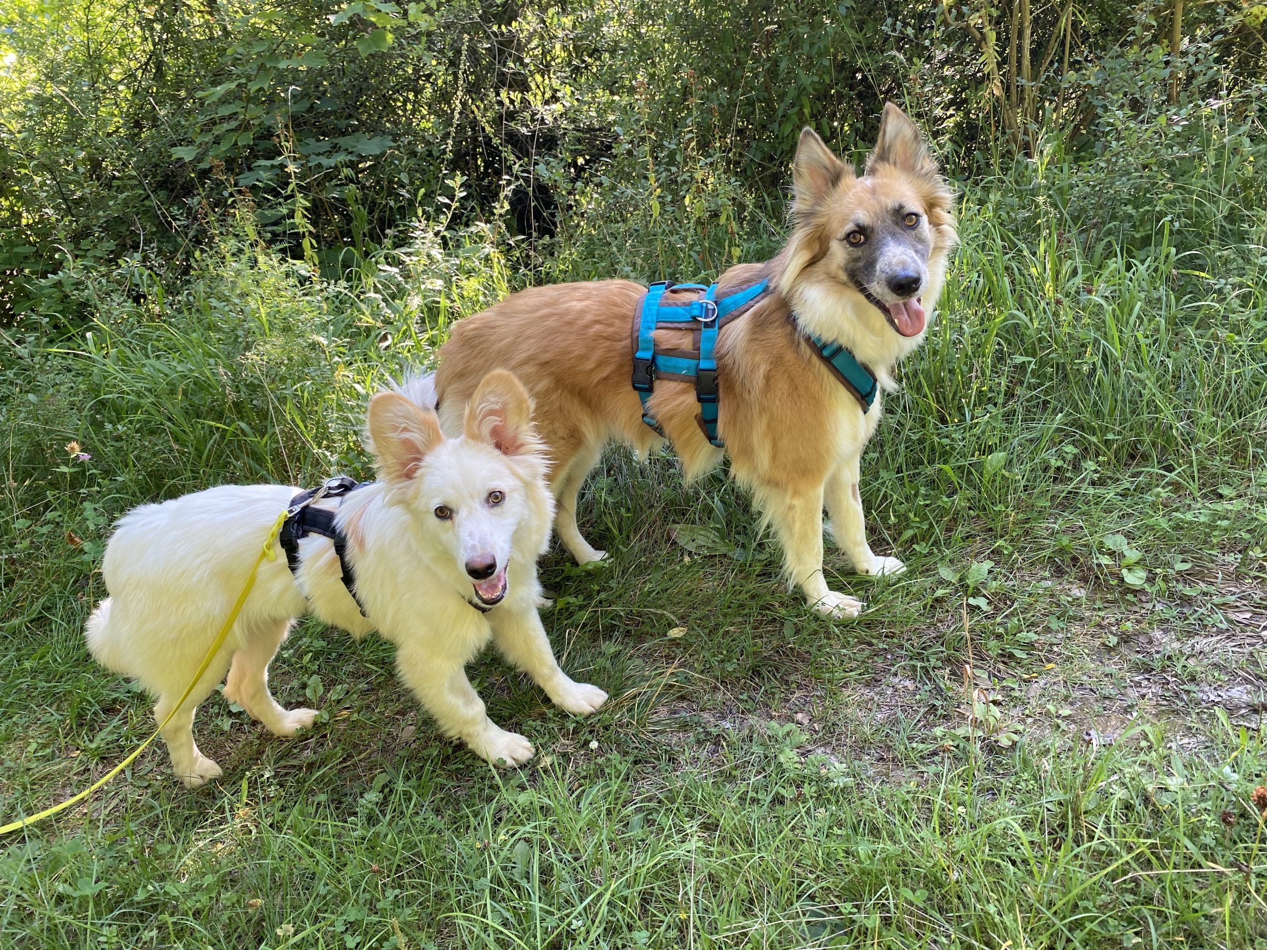 Die beiden Hundemädchen sind fast unzertrennlich und können jetzt ihre neue Welt gemeinsam erobern. Sie sind sehr anpassungsfähig und freunden sich auch gleich mit dem vorhandenen Rudel der Pflegestelle an.