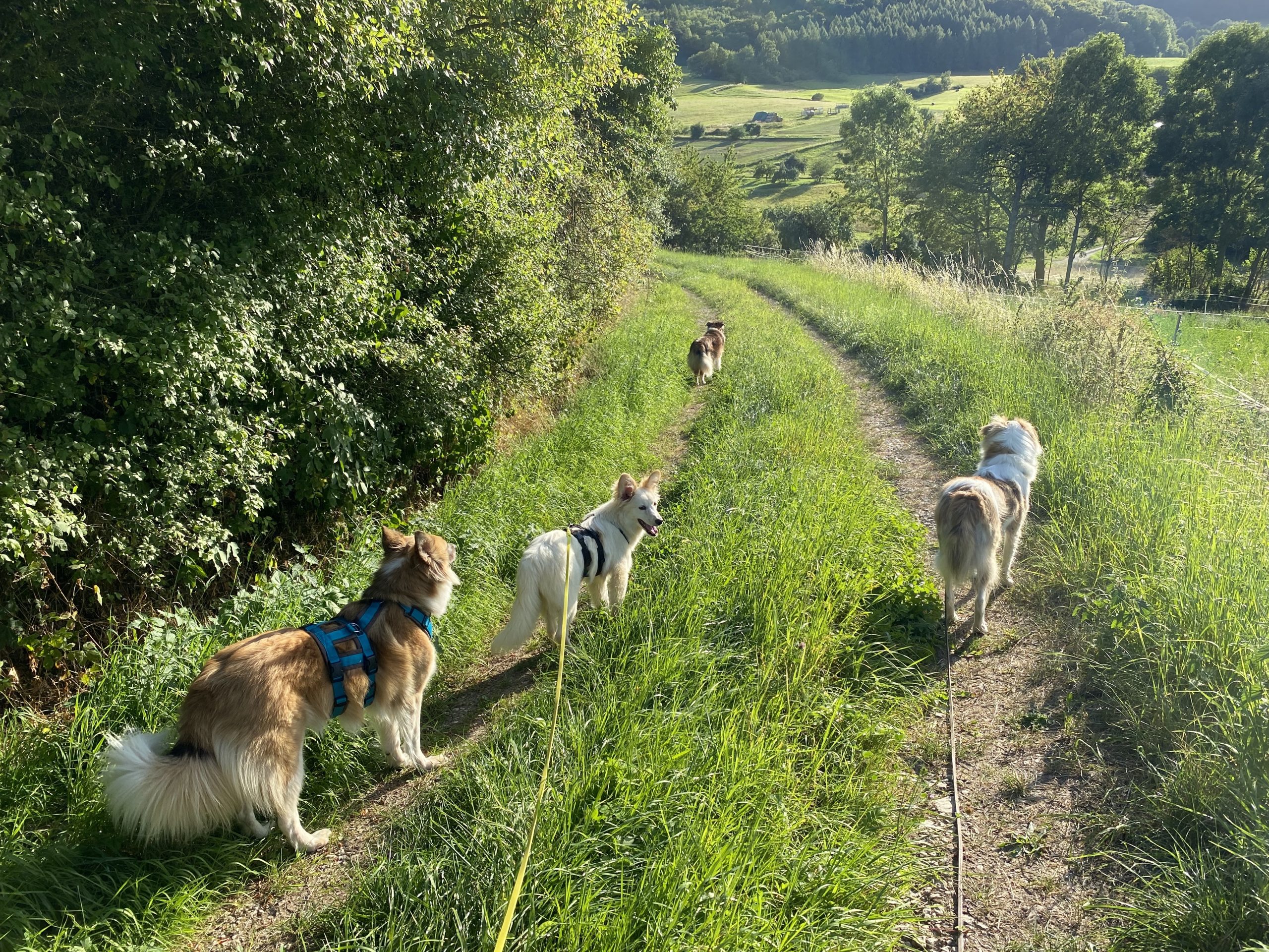 JENNA, die deutlich ältere und zurückhaltendere, brauchte etwas länger, um ihre Angst vor meinen – aus ihrer Sicht – riesengroßen Hunden zu überwinden. Klar, wenn man als kleine Hündin auf der Straße und später in einem gnadenlosen Tierheim gelebt hat, ist es vernünftig, andere erst mal „gefährlich“ knurrend auf Abstand zu halten. Aber ein kleiner Spaziergang mit der großen Sholeen, war dann doch toll. …
